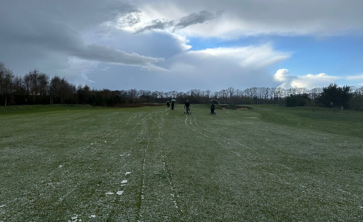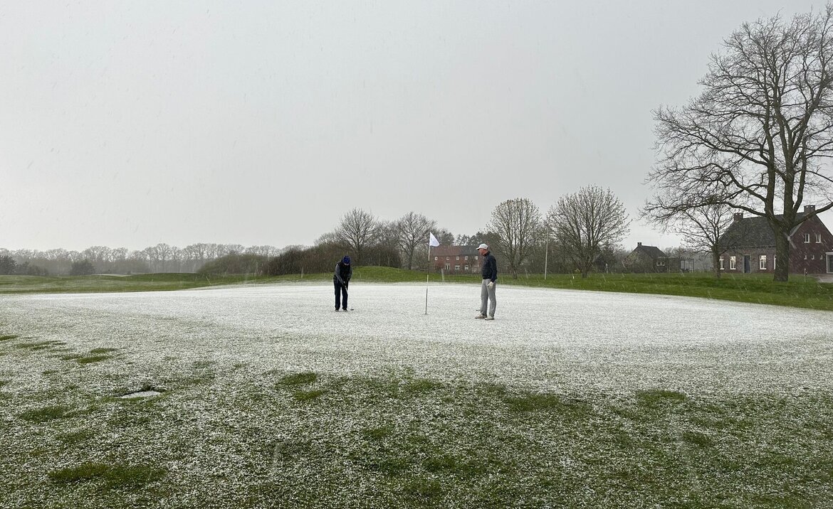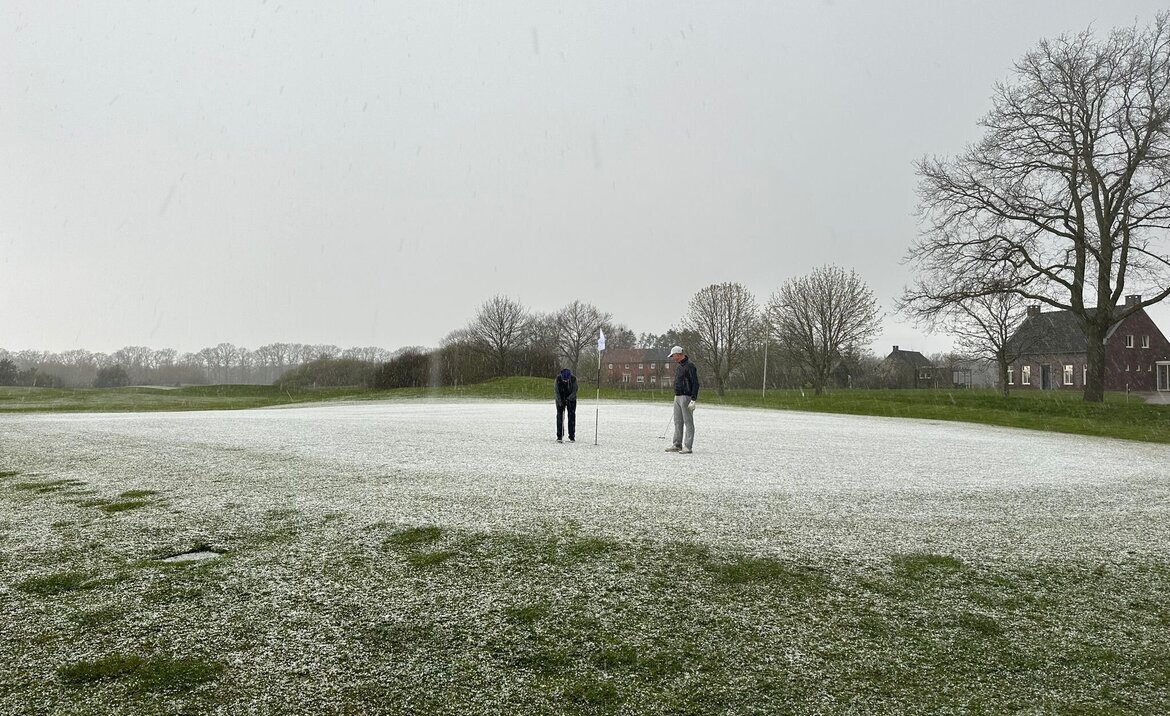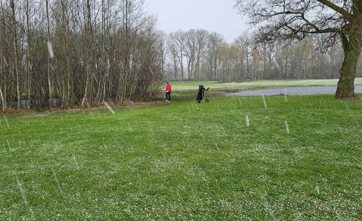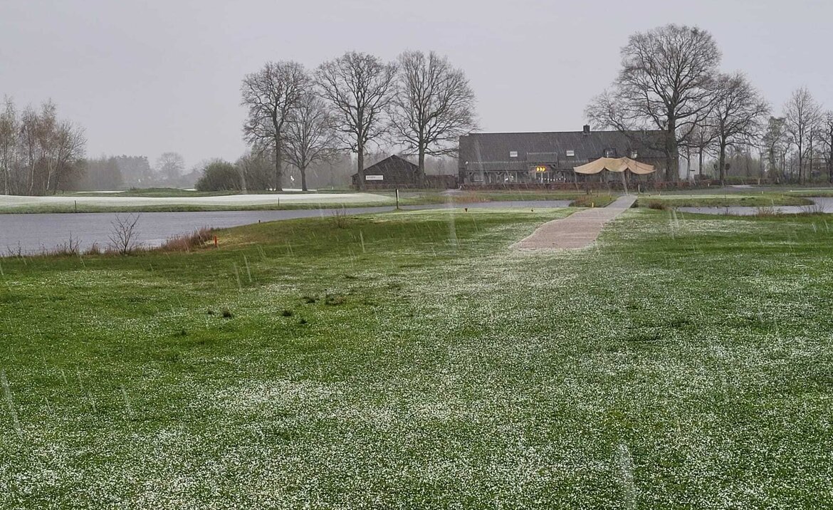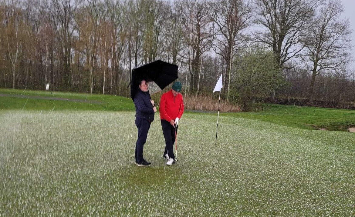 Maar op het moment dat de 1e flights zo rond hole 16 waren en de laatste op hole 10 liepen ging de hemel open en werden de greens wit door een fikse hagel bui. Daar valt dan nog mee te spelen maar met de komst van onweer was het helaas een voortijdig einde van de ronde. Na een pauze weer terug de baan in zat er helaas niet in daar het onrustig bleef qua onweer en buien.